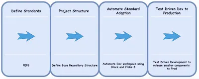 Like any other programming language, we started by defining our source of truth for standards. We went with PEP8 which is the standard that defines Coding Style Guides for Python. We went through the below key stages from Planning to Production. Key to learning and adopting a new language was putting in time for foundational work; automating compliance with PEP8 and adopting Py Tooling like Black and Flake8. Let’s go through some of the key elements to these stages. Define Standards and Automating AdoptionAs our team was new to Python, we spent the first initial few days defining standards on how we would code to comply with PEP8. But in addition to adoption, we needed to automate our workflow to comply with these standards.