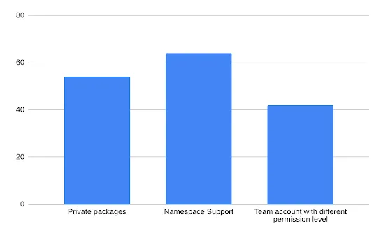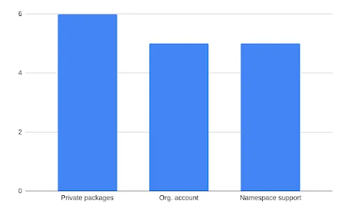 From the second survey, it was clear that features like organization accounts and namespace support would be most useful to users in a team. This team could represent an organization or community project. To confirm this finding, we held another poll asking users to choose between the three features- organization/team accounts, namespace support and private packages.