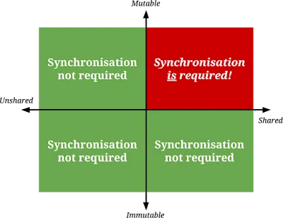 Mark shared a diagram of the “synchronization quadrants” from Kevlin Henney, where the vertical axes are “Mutable” and “Immutable”, and the horizontal axes are “Unshared” and “Shared”. The top-right quadrant corresponding to “Mutable and Shared” is red and shows that “Synchronization is required,” where all other quadrants show that “Synchronization not required”.